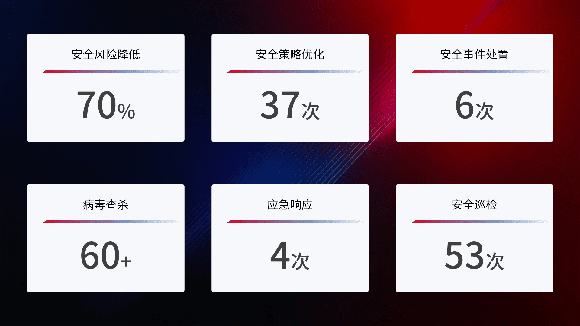 提供全面的安全事件报告体系,,,,包括处置报告、、、周报、、、季度和年度总结,,,结合持续监控,,,,帮助客户深入了解网络安全状况。。。