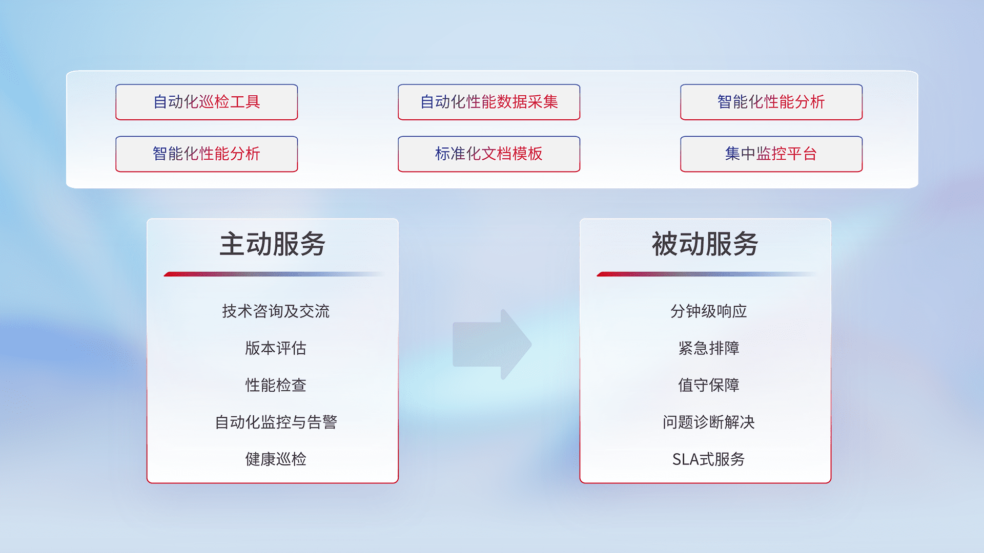 智能化工具和标准化文档,,,,保障服务质量,,,提供主动服务(包含技术咨询、、、、版本评估、、性能检查、、自动化监控与告警、、健康巡检)和被动服务包含(分钟级响应、、、紧急排障、、、值守保障、、问题诊断解决、、、SLA服务)。。。。