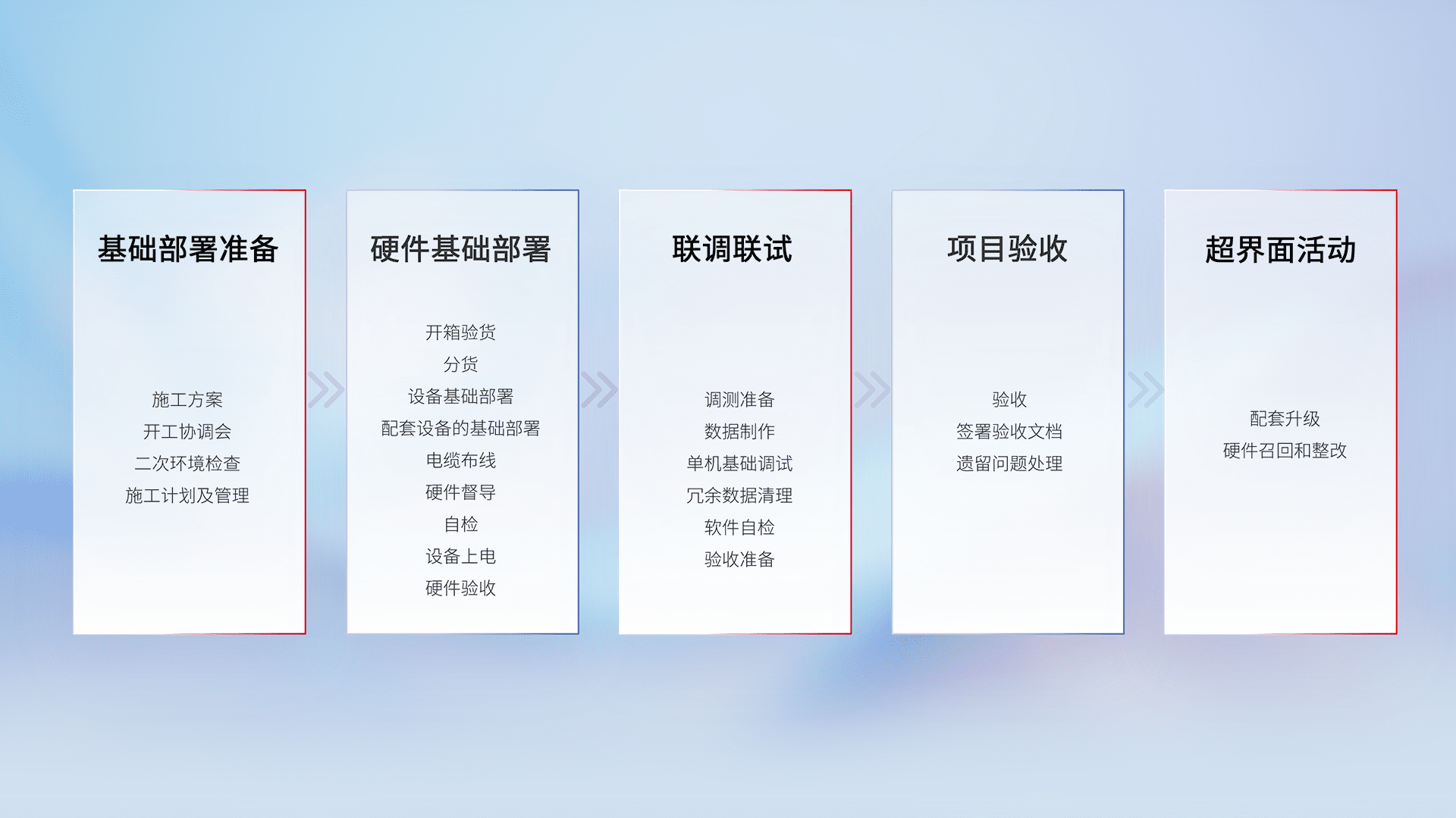 从基础部署准备、、、硬件基础部署、、、、联调联试、、、项目验收、、越界面活动的全过程可追溯,,,,保证施工质量和进度。。。。